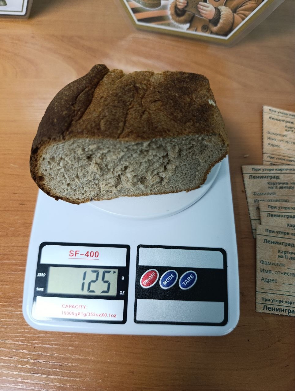 А так же напомнили про голод в блокаду, чем питались и на примере показали сколько грамм хлеба получали по карточкам.
